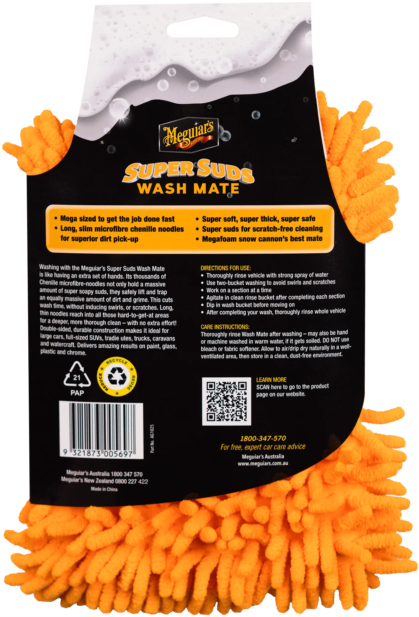 Washing with the Meguiar’s Super Suds Wash Mate is like having an extra set of hands. Its thousands of Chenille microfibre-noodles not only hold a massive amount of super soapy suds, they safely lift and trap an equally massive amount of dirt and grime. This cuts wash time, without inducing swirls, or scratches. Long, thin noodles reach into all those hard-to-get-at areas for a deeper, more thorough clean – with no extra effort! Double-sided, durable construction makes it ideal for large cars, full-sized SUVs, tradie utes, trucks, caravans and watercraft. Delivers amazing results on paint, glass, plastic and chrome.